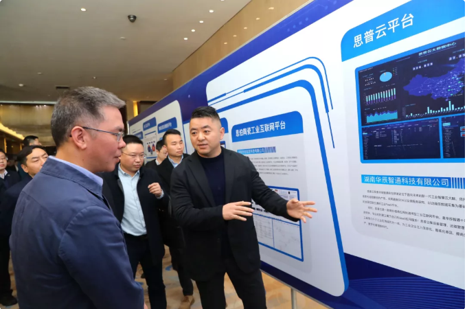 • AB钱包官网智通总经理傅帝向湖南省工业和信息化厅党组书记、厅长曹慧泉介绍思普云在工业领域应用情况
